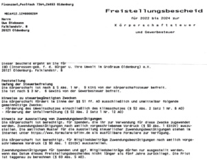 Die IBO ist mit Freistellungsbescheid des Finanzamts Oldenburg vom 12. Dezember 2025 für die Jahre 2022 bis 2024 von der Körperschaftssteuer und Gewerbesteuer befreit. Sie ist berechtigt, in der Zukunft gemäß § 63 Absatz 5 Nr. 1 der Abgabenordnung Zuwendungsbestätigungen für Spenden und Mitgliedsbeiträge auszustellen.